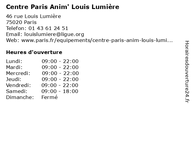 1 Centre d'animation Louis Lumière (Distance: 0,03 km) 46 rue Louis Lumière, 75020 Paris centre, centre d'animation, d'animation, equipement, joyeuse, l'heure, livre, louis, lumière, médiathèque, services 2 Centre d'animation Louis Lumière / Aide Aux Devoirs (Distance: 0,03 km) 46 rue Louis Lumière, 75020 Paris aide, aux, centre, centres d'animation, d'animation, devoirs, equipement, jardins, l'heure, livre, louis, lumière, médiathèque, services 3 Centre d'animation Louis Lumière / Anglais (Distance: 0,03 km) 46 rue Louis Lumière, 75020 Paris anglais, centre, centres d'animation, d'animation, equipement, jardins, l'heure, livre, louis, lumière, médiathèque, services 4 Centre d'animation Louis Lumière / Aquagym (Distance: 0,03 km) 46 rue Louis Lumière, 75020 Paris aquagym, centre, centres d'animation, d'animation, equipement, jardins, l'heure, livre, louis, lumière, médiathèque, services 5 Square Louis-Lumière (Du 29 octobre au 28 février) (Distance: 0,04 km) 42 rue Louis Lumière, 75020 Paris 28, 29, au, du, février, jardin, louis, lumière, octobre, parc, square 6 Square Louis-Lumière (Du 01 au 24 mars) (Distance: 0,04 km) 42 rue Louis Lumière, 75020 Paris 01, 24, au, du, jardin, louis, lumière, mars, parc, square |