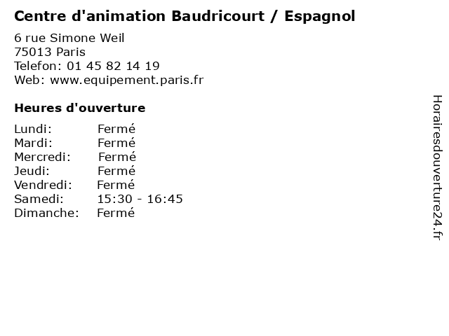 1 Centre d'animation Baudricourt / Aide Aux Devoirs (Distance: 0,00 km) 6 rue Simone Weil, 75013 Paris aide, aux, baudricourt, centre, centres d'animation, d'animation, devoirs, equipement, jardins, l'heure, livre, médiathèque, services 2 Centre d'animation Baudricourt / Aide Aux Démarches (Distance: 0,00 km) 6 rue Simone Weil, 75013 Paris aide, aux, baudricourt, centre, centres d'animation, d'animation, démarches, equipement, jardins, l'heure, livre, médiathèque, services 3 Centre d'animation Baudricourt / Anglais (Distance: 0,00 km) 6 rue Simone Weil, 75013 Paris anglais, baudricourt, centre, centres d'animation, d'animation, equipement, jardins, l'heure, livre, médiathèque, services 4 Centre d'animation Baudricourt / Aquarelle (Distance: 0,00 km) 6 rue Simone Weil, 75013 Paris aquarelle, baudricourt, centre, centres d'animation, d'animation, equipement, jardins, l'heure, livre, médiathèque, services 5 Centre d'animation Oudiné (Distance: 0,92 km) 5 rue Eugène Oudiné, 75013 Paris centre, centre d'animation, d'animation, equipement, joyeuse, l'heure, livre, médiathèque, oudiné, services 6 Centre d'animation Daviel (Distance: 0,94 km) 21 rue Albert Bayet, 75013 Paris centre, centre d'animation, d'animation, daviel, equipement, joyeuse, l'heure, livre, médiathèque, services |