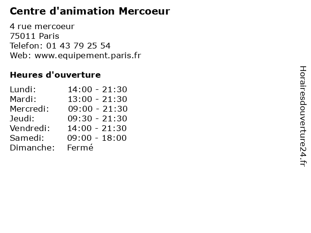 1 Mercoeur Judo (Distance: 0,01 km) 4 rue mercoeur, 75011 Paris club judo jiu-jitsu brésilien, judo, mercoeur, paris voltaire charonne 75011 2 Association MJC Paris Mercoeur (Le Centre) (Distance: 0,01 km) 4 Rue Mercoeur, 75011 Paris activités, association, centre, culturel, le, loisirs, mercoeur, mjc, paris, période, scolaire 3 Centre Paris Anim' Mercoeur (Distance: 0,01 km) 4 rue mercoeur, 75011 Paris anim', centre, espace exposition, mercoeur, paris, salle arts plastiques, salle informatique, salles de musique 4 La Poste - Paris Mercoeur (Distance: 0,15 km) 80 Rue Léon Frot, 75011 Paris agence, colis, courriers, expédition, la, mercoeur, paris, postale, poste, relais 5 Centre d'animation Victor Gelez (Distance: 0,91 km) 1-3 rue Victor Gelez, 75011 Paris centre, centre d'animation, d'animation, equipement, gelez, joyeuse, l'heure, livre, médiathèque, services, victor 6 Centre d'animation Ken Saro-Wiwa (Distance: 1,38 km) 63 rue Buzenval, 75020 Paris centre, centre d'animation, d'animation, equipement, joyeuse, ken, l'heure, livre, médiathèque, saro, services, wiwa |