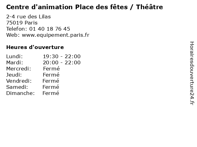 1 Centre d'animation Place des fêtes / Anglais (Distance: 0,00 km) 2-4 rue des Lilas, 75019 Paris anglais, centre, centres d'animation, d'animation, des, equipement, fêtes, jardins, l'heure, livre, médiathèque, place, services 2 Centre d'animation Place des fêtes / Arabe (Distance: 0,00 km) 2-4 rue des Lilas, 75019 Paris arabe, centre, centres d'animation, d'animation, des, equipement, fêtes, jardins, l'heure, livre, médiathèque, place, services 3 Centre d'animation Place des fêtes / Arts Martiaux (Distance: 0,00 km) 2-4 rue des Lilas, 75019 Paris arts, centre, centres d'animation, d'animation, des, equipement, fêtes, jardins, l'heure, livre, martiaux, médiathèque, place, services 4 Centre d'animation Place des fêtes / Arts Plastiques (Distance: 0,00 km) 2-4 rue des Lilas, 75019 Paris arts, centre, centres d'animation, d'animation, des, equipement, fêtes, jardins, l'heure, livre, médiathèque, place, plastiques, services 5 Centre d'animation Solidarité Angèle Mercier / Abdo-Fessiers/Dos/Cuisses (Distance: 0,73 km) 133-135 boulevard Serurier, 75019 Paris abdo, angèle, centre, centres d'animation, d'animation, equipement, fessiers/dos/cuisses, jardins, l'heure, livre, mercier, médiathèque, services, solidarité 6 Centre d'animation Solidarité Angèle Mercier / Aide Aux Devoirs (Distance: 0,73 km) 133-135 boulevard Serurier, 75019 Paris aide, angèle, aux, centre, centres d'animation, d'animation, devoirs, equipement, jardins, l'heure, livre, mercier, médiathèque, services, solidarité |