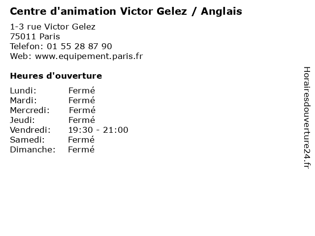 1 Centre d'animation Victor Gelez (Distance: 0,00 km) 1-3 rue Victor Gelez, 75011 Paris centre, centre d'animation, d'animation, equipement, gelez, joyeuse, l'heure, livre, médiathèque, services, victor 2 Centre d'animation Mercoeur (Distance: 0,91 km) 4 rue mercoeur, 75011 Paris centre, centre d'animation, d'animation, equipement, joyeuse, l'heure, livre, mercoeur, médiathèque, services 3 Centre d'animation Jemmapes (Distance: 1,77 km) 116 quai de Jemmapes, 75010 Paris centre, centre d'animation, d'animation, equipement, jemmapes, joyeuse, l'heure, livre, médiathèque, services 4 Centre d'animation Les Halles - le Marais (Distance: 2,77 km) 6-8 place Carrée, 75001 Paris centre, centre d'animation, d'animation, equipement, halles, joyeuse, l'heure, le, les, livre, marais, médiathèque, services 5 Centre d'animation Paul Valeyre (Distance: 3,07 km) 24 rue de Rochechouart, 75009 Paris centre, centre d'animation, d'animation, equipement, joyeuse, l'heure, livre, médiathèque, paul, services, valeyre 6 Centre d'animation Tour des Dames (Distance: 3,89 km) 14-18 rue de la Tour des Dames, 75009 Paris centre, centre d'animation, d'animation, dames, des, equipement, joyeuse, l'heure, livre, médiathèque, services, tour |