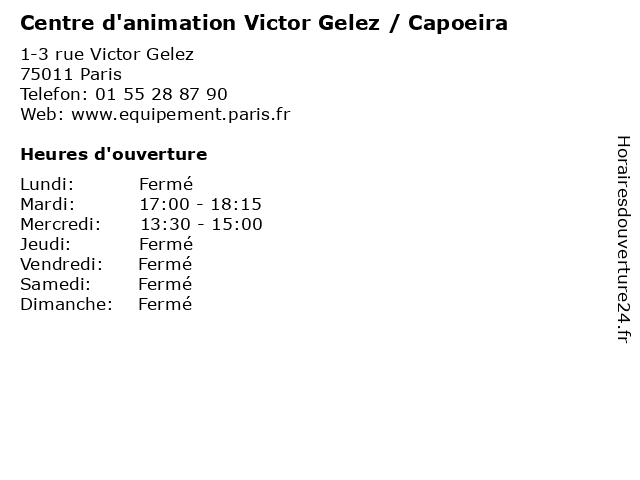 1 Centre d'animation Victor Gelez (Distance: 0,00 km) 1-3 rue Victor Gelez, 75011 Paris centre, centre d'animation, d'animation, equipement, gelez, joyeuse, l'heure, livre, médiathèque, services, victor 2 Centre d'animation Mercoeur (Distance: 0,91 km) 4 rue mercoeur, 75011 Paris centre, centre d'animation, d'animation, equipement, joyeuse, l'heure, livre, mercoeur, médiathèque, services 3 Centre d'animation Jemmapes (Distance: 1,77 km) 116 quai de Jemmapes, 75010 Paris centre, centre d'animation, d'animation, equipement, jemmapes, joyeuse, l'heure, livre, médiathèque, services 4 Centre d'animation Les Halles - le Marais (Distance: 2,77 km) 6-8 place Carrée, 75001 Paris centre, centre d'animation, d'animation, equipement, halles, joyeuse, l'heure, le, les, livre, marais, médiathèque, services 5 Centre d'animation Paul Valeyre (Distance: 3,07 km) 24 rue de Rochechouart, 75009 Paris centre, centre d'animation, d'animation, equipement, joyeuse, l'heure, livre, médiathèque, paul, services, valeyre 6 Centre d'animation Tour des Dames (Distance: 3,89 km) 14-18 rue de la Tour des Dames, 75009 Paris centre, centre d'animation, d'animation, dames, des, equipement, joyeuse, l'heure, livre, médiathèque, services, tour |