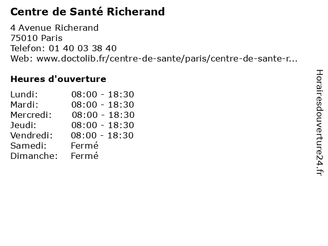 1 Centre de santé Richerand (Distance: 0,02 km) 4 Avenue Richerand, 75010 Paris angéiologie, centre, consultation, de, docteur, national, richerand, santé, secrétariat 2 CMB - Santé au Travail (Distance: 1,38 km) 7 Rue Bergère, 75441 Paris au, centre, cmb, famille, médical, santé, travail 3 Assurance Retraite et Santé au Travail (Distance: 1,52 km) 17-19 Avenue de Flandre, 75954 Paris administration, assoc, assurance, au, et, retraite, santé, services, services publics, travail 4 Espace Santé-Beauté Auchan (Distance: 3,82 km) 28 Avenue du Général de Gaulle, 93541 Bagnolet auchan, beaute, beauté, boutiques, brasserie, cache, chaussures, concorde, deco, enfants, espace, mode femme, mode hommes, restaurant, santé, sport 6 Dr Antonio Richerand - Psychiatre (Distance: 4,79 km) 17 Boulevard de Vaugirard, 75015 Paris antonio, dr, folie, psychiatre, psychiatrie, psychiatrique, richerand |