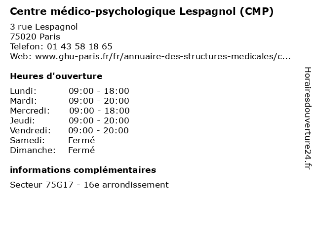 1 Centre médico-psychologique Cardeurs (CMP) (Distance: 1,12 km) 13 square des Cardeurs, 75020 Paris cardeurs, centre, cmp, consultation, docteur, med, médecin, médico, psychologique, traitement 2 Clinique Médico-Dentaire Richard Lenoir (Distance: 1,75 km) 107 Boulevard Richard Lenoir, 75011 Paris care, clinic, clinique, dentaire, dentiste, lenoir, medecin, médico, richard 3 CMP de la Croix Rouge (Distance: 1,99 km) 4 Rue Lieutenant Thomas, 93170 Bagnolety bureau, cmp, consultation, croix, de, dr, la, maladie, med, médecin, médecine, pratique, rouge, thérapie, traitement 4 Centre Médico Psycho Pédagogique (Cmpp) (Distance: 2,14 km) 3 Rue Adélaïde Lahaye, 93170 Bagnolety bureau, centre, cmpp, consultation, dr, maladie, med, médecin, médecine, médico, pratique, psycho, pédagogique, thérapie, traitement 5 CMP - Change de Métaux Précieux (Distance: 2,45 km) 11 Rue Portefoin, 75003 Paris achat, boutique, change, cmp, de, métaux, or, précieux, vente 6 L'Institut Mutualiste Montsouris - Le Centre Médico-Psychologique (CMP) La Harpe (Distance: 3,59 km) 45 Rue de la Harpe, 75005 Paris bureau, centre, cmp, consultation, dr, harpe, l'institut, la, la maladie, la médecine, la pratique, le, med, montsouris, mutualiste, médecin, médico, psychologique, thérapie, traitement |