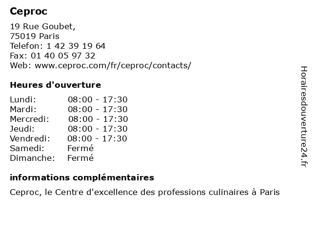 1 Ceproc - centre d'excellence des professions culinaires (Distance: 0,05 km) 19 Rue Goubet, 75019 Paris centre, ceproc, cuisine, culinaire, culinaires, d'excellence, des, formation, professions, école 2 Maison des Chefs (Distance: 3,37 km) 1 Rue Ambroise Thomas, 75009 Paris chefs, class, cooking, des, food, maison 3 Laminiak - Atelier Pâtisserie (Distance: 3,42 km) 10 Rue de la Petite Pierre, 75011 Paris atelier, chefs, cours, cuisine, ecole, formation, laminiak, pâtisserie 4 L'atelier des Chefs Paris Saint Lazare (Distance: 3,95 km) 20 Rue Saint-Lazare, 75009 Paris chefs, class, cooking, des, food, l'atelier, lazare, paris, saint 5 L'Atelier des Chefs (Distance: 4,20 km) 8 Rue Pernelle, 75004 Paris chefs, cuisine, d'cuisine, des, ecole, l'atelier, loisirs, restaurant, restauration, sports 6 L Atelier Des Chefs (Distance: 4,21 km) 21 Cours De Vincennes, 75020 Paris atelier, chefs, restaurants |