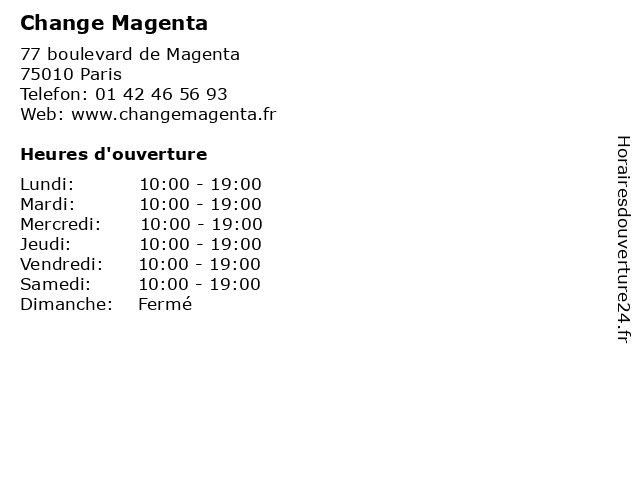 1 Change Magenta (Distance: 0,87 km) 77 boulevard de Magenta, 75010 Paris billets, bureau, change, divises, magenta 2 Audition Lefeuvre Magenta (Distance: 0,05 km) 74 Boulevard de Magenta, 75010 Paris audition, lefeuvre, magenta 3 Parking Indigo Magenta - Gare de l'Est (Distance: 0,08 km) 2 Square Alban Satragne, 75010 Paris borne de recharge pour véhicules électriques, de, gare, indigo, l'est, magenta, parking 4 McDonald's Paris Magenta (Distance: 0,08 km) 84 Boulevard Magenta, 75010 Paris burgers, fast, food, hamburgers, magenta, mcdonald's, paris, rapide, restaurant, restauration 5 La Poste - Paris Agence Conseil Magenta (Distance: 0,09 km) 67 Boulevard de Magenta, 75010 Paris agence, colis, conseil, courriers, expédition, la, magenta, paris, postale, poste, relais 6 |
