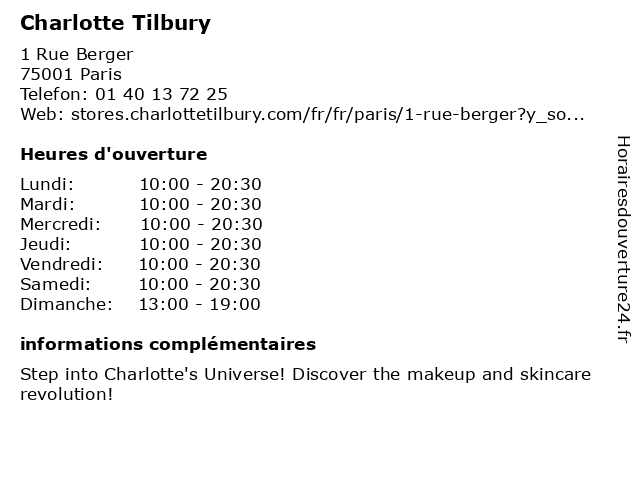 1 Charlotte Tilbury (Distance: 0,19 km) 4 Passage La Canopée C.c. La Canopée, 75001 Paris charlotte, clinique de soins de la peau, drugstores, maquilleur/maquilleuse, parfumerie, salon de beauté, tilbury 2 Charlotte Tilbury (Distance: 0,41 km) 75 Rue De Rivoli, 75001 Paris charlotte, clinique de soins de la peau, drugstores, maquilleur/maquilleuse, parfumerie, salon de beauté, tilbury 3 Charlotte Tilbury (Distance: 1,73 km) 21/ 23 Bld Haussmann, 75009 Paris charlotte, clinique de soins de la peau, drugstores, maquilleur/maquilleuse, parfumerie, salon de beauté, tilbury 4 Charlotte Tilbury (Distance: 2,27 km) 109 Rue Saint Lazare, 75009 Paris charlotte, clinique de soins de la peau, drugstores, maquilleur/maquilleuse, parfumerie, salon de beauté, tilbury 6 Charlotte Tilbury (Distance: 4,99 km) 05 Rue Linois Cc Beaugrenelle Ilot Pegase, 75015 Paris charlotte, clinique de soins de la peau, drugstores, maquilleur/maquilleuse, parfumerie, salon de beauté, tilbury |