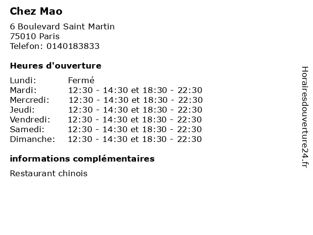 | Mardi | 12:30-14:30 et 18:30-22:30 |