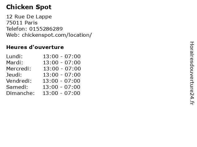 1 Chicken Spot (Distance: 1,95 km) 12 rue Xavier Privas, 75005 Paris boissons, burger, chicken, frites, poulet, spot 2 Chicken Spot (Distance: 1,95 km) 12 Rue Xavier Privas, 75005 Paris boissons, chicken, poulet, restaurants, sandwich, spot 3 Chicken Spot (Distance: 3,53 km) 17 Rue d'Aubervilliers, 75018 Paris bar, bistro, bistrot, brasserie, café, chicken, restaurant, restauration, spot 4 Chicken Spot (Distance: 3,54 km) 220 Rue de Paris, 93100 Montreuil boissons, chicken, nourriture, restaurant, service, spot 5 Chicken Spot (Distance: 4,63 km) 88 Boulevard Paul Vaillant Couturier, 94200 Ivry-sur-Seine burger, chicken, fastfood, restaurants, spot 6 Chicken Spot (Distance: 8,04 km) - Boulevard Maurice Thorez, 93000 Bobigny alimentation, chicken, dessert, restauration, spot |
