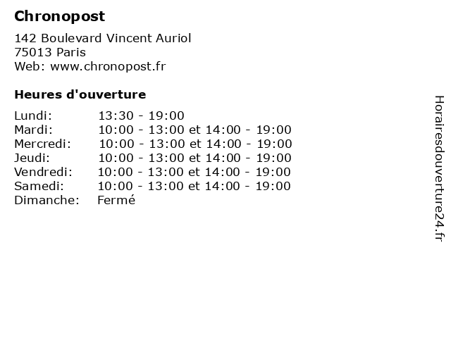 1 Chronopost (Distance: 0,79 km) 88 Boulevard Saint Marcel, 75005 Paris assurances et services, banques, chronopost 3 Chronopost (Distance: 1,47 km) 46 Rue Mouffetard, 75005 Paris assurances et services, banques, chronopost 4 Chronopost (Distance: 1,97 km) 161 Rue Saint Jacques, 75005 Paris assurances et services, banques, chronopost 5 Chronopost (Distance: 2,60 km) 26 Rue du Pont Louis-Philippe, 75004 Paris assurances et services, banques, chronopost 6 Chronopost (Distance: 2,94 km) 79 Boulevard Beaumarchais, 75003 Paris assurances et services, banques, chronopost |