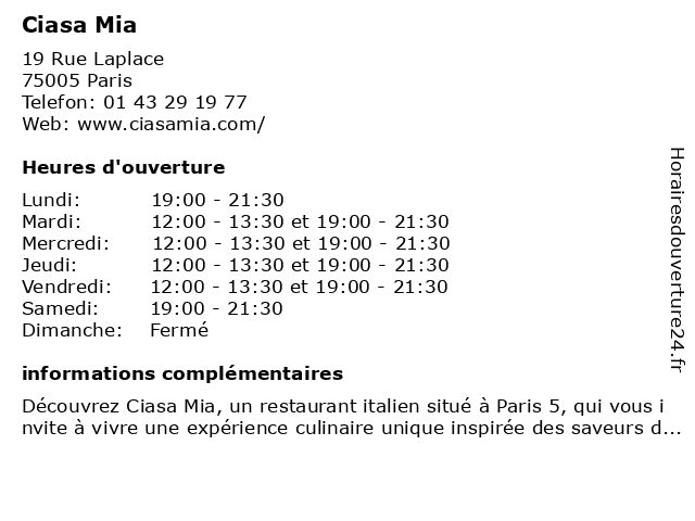 1 Mamma Mia (Distance: 0,61 km) 11bis Rue Xavier Privas, 75005 Paris mamma, menu, mia, pizza, restaurant, restauration 2 Maître Mia Gal - Avocate (Distance: 1,30 km) 11 Boulevard de Sébastopol, 75001 Paris avocate, avocats, cabinet, conseils, contentieux, gal, juridique, justice, litiges, maître, mia, services 3 Terra Mia (Distance: 1,38 km) 118 Boulevard du Montparnasse, 75014 Paris italien, mia, pizza, restaurants, terra, traditionnel 4 Mamma Mia (Distance: 2,11 km) 176 Rue Saint Denis, 75002 Paris mamma, menu, mia, pizza, restaurant, restauration 5 Joya Mia (Distance: 2,16 km) 96 Rue De Charenton, 75012 Paris joya, mia, service de livraison, supermarchés 6 |