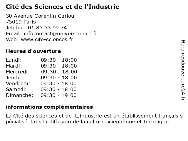 1 Enterprise Location Voiture et Utilitaire - Paris Porte De La Villette Cite Des Sciences (Distance: 0,19 km) 61 Boulevard Macdonald, 75019 Paris Xix cite, de, des, enterprise, et, la, location, paris, porte, sciences, utilitaire, villette, voiture 2 Parking Indigo Parc de la Villette Nord - Cité des Sciences (Distance: 0,20 km) 61 Boulevard Macdonald, 75019 Paris borne de recharge pour véhicules électriques, cité, de, des, indigo, la, nord, parc, parking, sciences, villette 3 ibis Paris la Villette Cité des Sciences 19ème (Distance: 0,47 km) 31-35 Quai De L'oise, 75019 Paris 19ème, cité, des, ibis, la, paris, sciences, villette 4 Parking Q-park Cité de la Musique - Conservatoire (Distance: 0,75 km) 8 Avenue du Nouveau Conservatoire, 75019 Paris abonné, cité, conservatoire, de, la, musique, park, parking, stationnement 5 Yespark, location de parking au mois - Cité de la Musique - Paris (Distance: 0,79 km) 8 Rue Adolphe Mille, 75019 Paris au, cité, de, la, location, mois, musique, paris, parking, yespark 6 Parking Indigo Paris La Villette Cité De La Musique (Distance: 0,81 km) 211 Avenue Jean Jaurès, 75019 Paris borne de recharge pour véhicules électriques, cité, de, indigo, la, musique, paris, parking, villette |