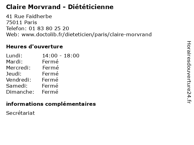 1 Claire Morvrand - Diététicienne (Distance: 13,76 km) 4 Rue Utrillo, 93370 Montfermeil alimentation, claire, dieteticien, diététicien, diététicienne, morvrand, nourriture, sante 2 Dalila Nebri - Diététicienne (Distance: 0,34 km) 127 Boulevard Voltaire, 75011 Paris alimentation, dalila, dieteticien, diététicienne, nebri, nourriture, sante 3 La Table de Claire (Distance: 0,54 km) 30 rue Emile Lepeu, 75011 Paris bistrot, claire, de, la, restaurant, table 4 Dr Claire Debes - Anesthésiste (Distance: 0,54 km) 184 Rue du Faubourg Saint-Antoine, 75012 Paris anesthésiste, claire, consultation, debes, docteur, dr, med, medecine, medical, médecin, traitement 5 Claire Parada - Psychologue (Distance: 0,74 km) 65 Avenue Philippe Auguste, 75011 Paris claire, parada, psy, psychiatre, psychologue, sante, soins 6 Claire Potdevin - Masseur-kinésithérapeute (Distance: 0,82 km) 18 Rue Crozatier, 75012 Paris claire, docteur, kine, kinesitherapeute, kinésithérapeute, masseur, potdevin |