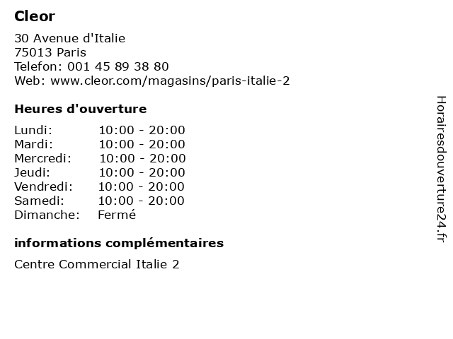 2 Cleor (Distance: 6,06 km) 28 Avenue du Général de Gaulle, 93541 Bagnolet beaute, boutiques, brasserie, cache, chaussures, cleor, concorde, deco, enfants, mode femme, mode hommes, restaurant, sport 3 Cleor (Distance: 10,39 km) 20 rue de Bezons, 92400 Courbevoie bagues, bijoux, bracelets, cleor, colliers, marques, montres 4 Cleor (Distance: 10,64 km) 257 Avenue du General de Gaulle, 93117 Rosny-sous-Bois bagues, bijoux, bracelets, cleor, colliers, marques, montres 5 Bijouterie Cleor (Distance: 0,00 km) 30 Avenue d'Italie, 75013 Paris accessoires, argent, bijouterie, bijoutier, bijoux, cleor, diamant, fantaisies, joaillerie, joaillier, mode, or, swarovski 6 Cleor PARIS (Distance: 5,50 km) 109 Rue St Lazare, 75009 Paris business, cleor, clothing, paris, shopping, stores  |