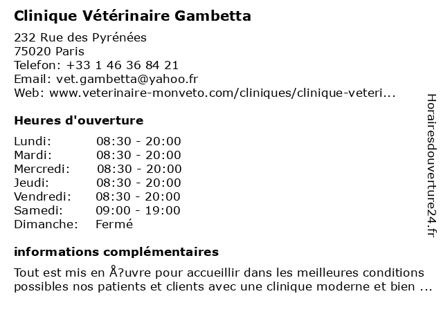 1 Clinique Vétérinaire Gambetta (Distance: 0,00 km) 232 Rue des Pyrénées, 75020 Paris clinique, gambetta, vétérinaire 2 Hôtel Hipotel Paris Gambetta Pyrénées (Distance: 0,76 km) 60 Rue Belgrand, 75020 Paris cafe, gambetta, hipotel, hotel, hôtel, paris, pyrénées, restaurant, service 3 Parking Gambetta - Paris France Parking (Distance: 0,91 km) 211 Avenue Gambetta, 75020 Paris car, france, gambetta, paris, parking 4 Hôtel Lilas Gambetta (Distance: 0,99 km) 223 Avenue Gambetta, 75020 Paris cafe, gambetta, hotel, hôtel, lilas, restaurant, service 5 École maternelle publique Gambetta (Distance: 8,83 km) 1 Rue Gambetta, 92170 Vanves cours, gambetta, maternelle, publique, servicios, école 6 Parc Gambetta - Du 1er octobre au 31 mars (Distance: 11,33 km) - Avenue Gambetta, 92400 Courbevoie 1er, 31, arbre, au, du, espace vert, forêt, gambetta, jardin, loisirs, mars, nature, octobre, parc, prairie, square |