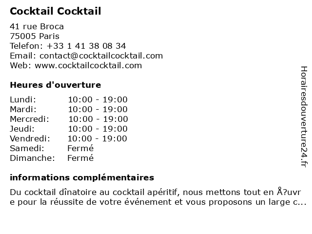 1 Solera Paris - Bar à Cocktail (Distance: 0,58 km) 283 Rue Saint Jacques, 75005 Paris bar, bière, boissons, brasserie, cocktail, cocktails, débits, paris, soirée, solera 2 Le 43 Cocktail Bar (Distance: 1,71 km) 4 Rue Danton, 75006 Paris 43, bar, boissons, cocktail, le, musique, pub 3 Cocktail Scandinave (Distance: 2,17 km) 43 Boulevard henri 4, 75004 Paris cocktail, magasin, meuble, paris, scandinave 4 Experimental Cocktail Club (Distance: 3,13 km) 37 Rue Saint-Sauveur, 75002 Paris bars, club, clubs, cocktail, drinks, experimental, lounges 5 Syndicat Cocktail Club (Distance: 3,79 km) 51 Rue du Faubourg Saint-Denis, 75010 Paris bar, boissons, café, club, cocktail, fast-food, syndicat 6 |