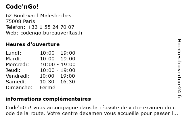 2 La Poste - Centre d’examen du code de la route (Distance: 0,21 km) 101 Boulevard Malesherbes, 75008 Paris centre, centre d'évaluation scolaire, code, de, du, d’examen, la, poste, route, école technique 3 La Poste - Centre d’examen du code de la route (Distance: 0,54 km) 1 Rue De Saint Petersbourg, 75008 Paris centre, centre d'évaluation scolaire, code, de, du, d’examen, la, poste, route, école technique 4 La Poste - Centre d’examen du code de la route (Distance: 0,62 km) 7 Rue De La Pépinière, 75008 Paris centre, centre d'évaluation scolaire, code, de, du, d’examen, la, poste, route, école technique 5 Dr Philippe Ngo - Chirurgien viscéral et digestif (Distance: 0,82 km) 15 Rue du Cirque, 75008 Paris chirurgie, chirurgien, digestif, dr, et, general, ngo, philippe, soins, viscéral 6 Centre d’examen du code de la route - DEKRA (Distance: 1,24 km) 91 Avenue de Wagram, 75017 PARIS centre, code, cours, de, dekra, du, d’examen, examens, formation, la, permis, route |