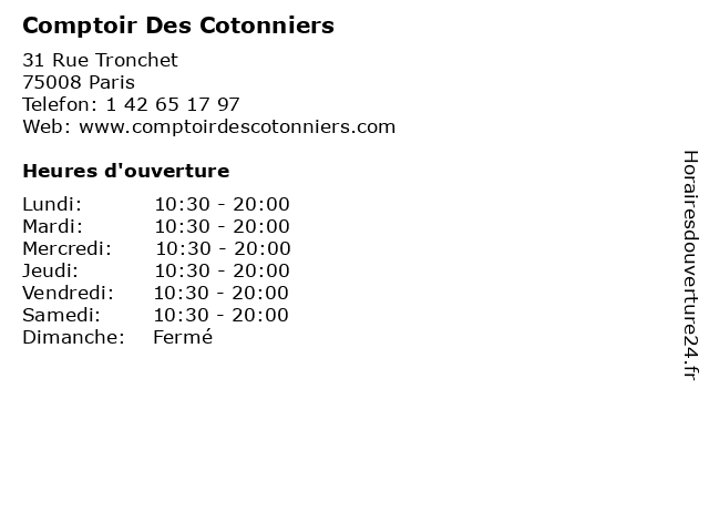 1 Comptoir Des Cotonniers (Distance: 0,44 km) 40 Boulevard Haussmann, 75009 Paris accessoires, chaussures, comptoir, cotonniers, des, mode femme 2 Comptoir Des Cotonniers (Distance: 0,52 km) 17 Rue De La Paix, 75002 Paris accessoires, chaussures, comptoir, cotonniers, des, mode femme 3 Comptoir des Cotonniers (Distance: 2,48 km) 35 rue de Sèvres, 75006 Paris comptoir, cotonniers, des, magasin, prêt à porter, textiles, vétêments 4 Comptoir des Cotonniers (Distance: 2,57 km) 25 Avenue Victor Hugo, 75016 Paris accessoires, chaussures, comptoir, cotonniers, des, mode femme 5 Comptoir des Cotonniers (Distance: 3,39 km) 22 Rue du Départ, 75015 Paris accessoires, comptoir, cotonniers, des, femme, mode, vêtements 6 Comptoir Des Cotonniers (Distance: 4,24 km) 274 Rue De Vaugirard, 75015 Paris accessoires, chaussures, comptoir, cotonniers, des, mode femme |