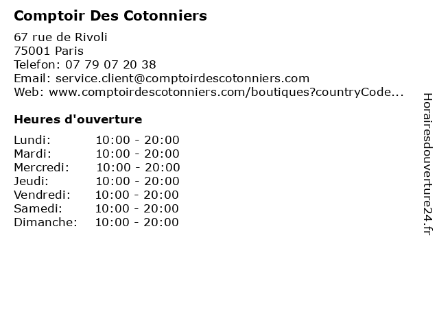 1 Comptoir des Cotonniers (Distance: 0,30 km) . Forum des Halles, 75001 Paris accessoires, comptoir, cotonniers, des, femme, mode, vêtements 2 Comptoir des Cotonniers (Distance: 0,55 km) 35 Rue Etienne Marcel, 75001 Paris accessoires, chaussures, comptoir, cotonniers, des, mode femme 3 Comptoir Des Cotonniers (Distance: 0,90 km) 30 Rue De Buci, 75006 Paris accessoires, chaussures, comptoir, cotonniers, des, mode femme 4 Comptoir des Cotonniers (Distance: 0,93 km) 14 rue Sainte Croix de la Bretonnerie, 75004 Paris accessoires, chaussures, comptoir, cotonniers, des, mode femme 5 Comptoir Des Cotonniers (Distance: 1,06 km) 176 Boulevard Saint Germain, 75006 Paris accessoires, chaussures, comptoir, cotonniers, des, mode femme 6 Comptoir des Cotonniers (Distance: 1,14 km) 47 Rue de Rennes, 75006 Paris accessoires, chaussures, comptoir, cotonniers, des, mode femme |