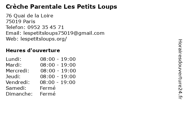 | 1 Crèche collective municipale de Rouen (Distance: 0,20 km) 13bis Rue de Rouen, 75019 Paris collective, crèche, crèches, de, municipale, rouen, services, services à la personne 2 Crèche collective municipale de Crimée (Distance: 0,31 km) 171 Rue de Crimée, 75019 Paris 19ème, collective, crimée, crèche, crèches, de, municipale, services, services à la personne 3 Crèche Crescendo Les Enfants d'Abord (Distance: 0,38 km) 93 Rue de Meaux, 75019 Paris associative, collective, crescendo, crèche, d'abord, enfant, enfants, garde d'enfants, jardin d'enfants, les, pédagogie, soins toute la journée 4 Crèche collective CNAVTS (associative) (Distance: 0,39 km) 12-14 Rue de Joinville, 75019 Paris associative, cnavts, collective, crèche, enfant, garde d'enfants, jardin d'enfants, pédagogie, soins toute la journée 5 Crèche collective associative A tire d'ailes (Distance: 0,40 km) 1bis Rue de Joinville, 75019 Paris associative, collective, crèche, d'ailes, enfant, garde d'enfants, jardin d'enfants, pédagogie, soins toute la journée, tire 6 Crèche collective Jeunesse Loubavitch (associative) (Distance: 0,40 km) 27 Rue Riquet, 75019 Paris associative, collective, crèche, enfant, garde d'enfants, jardin d'enfants, jeunesse, loubavitch, pédagogie, soins toute la journée |
