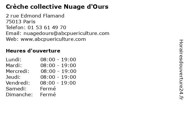 1 Crèche People and Baby - Giono (Distance: 0,26 km) 3 Rue Jean Giono, 75013 Paris and, baby, crèche, crèches, garde d'enfants, giono, les services parentalité, people, projet social, projet éducatif 2 Crèche collective Pitié (Distance: 0,49 km) 83 Boulevard de l'Hôpital de la PitiéSalpétrière, 75013 Paris collective, crèche, crèches, pitié, services, services à la personne 3 Crèche Enfant Present (Distance: 0,55 km) 1 Rue Pierre Gourdault, 75013 Paris crèche, crèches, enfant, present, services, services à la personne 4 Crèche collective Pommard (Distance: 0,90 km) 27 Rue Pommard, 75012 Paris collective, crèche, crèches, pommard, services, services à la personne 5 Crèche Collective Municipale - Duméril (Distance: 1,04 km) 12 Rue Duméril, 75013 Paris collective, crèche, duméril, enfants, familiale, garde, garderie, halte, municipale 6 Crèche Duméril 13ème (Distance: 1,06 km) 12 Rue Duméril, 75013 Paris 13ème, crèche, crèches, duméril, services, services à la personne |