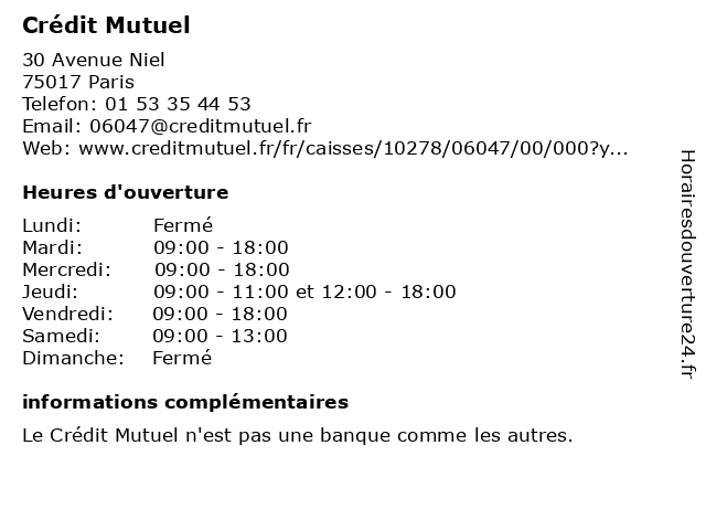 1 Crédit Mutuel (Distance: 1,09 km) 173 Boulevard Haussmann, 75008 Paris agence, assurance, banque, credit, crédit, mutuel 2 Crédit Mutuel (Distance: 1,15 km) 101 Rue Cardinet, 75017 Paris agence, assurance, bancaire, banque, crédit, mutuel 3 Crédit Mutuel (Distance: 1,31 km) 27 Rue De Chartres, 92200 Neuilly Sur Seine compagnie de téléphone, crédit, mutuel, organisme d'assurance 4 Crédit Mutuel (Distance: 2,09 km) 30 Boulevard Des Batignolles, 75017 Paris compagnie de téléphone, crédit, mutuel, organisme d'assurance 5 Crédit Mutuel (Distance: 2,09 km) 30 Boulevard des Batignolles, 75017 Paris agence, assurance, bancaire, banque, crédit, mutuel 6 Crédit Mutuel (Distance: 2,47 km) 84 RUE DE NEUILLY, 92110 CLICHY crédit, l'argent, l'épargne, le crédit, les banques, les prêts, mutuel |