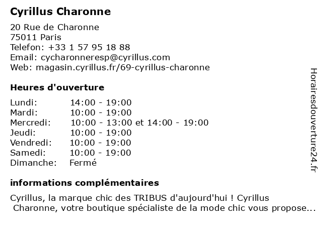 | Mercredi | 10:00-13:00 et 14:00-19:00 |