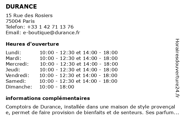 4 Naturenville Durance Paris 12ème (Distance: 3,33 km) 2 rue de la Durance, 75012 PARIS 12ème, biodiversité, biologiques, durance, environnement, naturenville, paris, producteurs 5 Boutique Durance (Distance: 17,85 km) 26 Rue de la Paroisse, 78000 Versailles accessoires, bougie, boutique, cadeau, crèmes, durance, lotions, parfum |