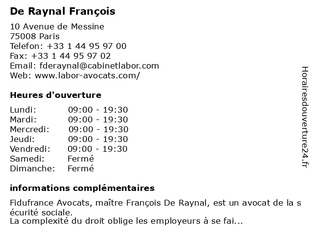 1 Maître François Ondoa Messi - Avocat (Distance: 0,06 km) 134 Boulevard Haussmann, 75008 Paris avocat, avocats, cabinet, conseils, contentieux, françois, juridique, justice, litiges, maître, messi, ondoa, services 2 François Schnerr - Chiropracteur (Distance: 0,08 km) 2 Avenue de Messine, 75008 Paris chiro, chiropracteur, françois, sante, schnerr, soins 3 Maître François Gordon - Avocat (Distance: 0,09 km) 9 Avenue de Messine, 75008 Paris avocat, droit, françois, gordon, maître, négociation 4 Maître Pierre-François Ozanne - Avocat (Distance: 0,10 km) 64 Rue de Miromesnil, 75008 Paris avocat, avocats, cabinet, conseils, contentieux, françois, juridique, justice, litiges, maître, ozanne, pierre, services 5 Maître Jean-François Carré - Avocat (Distance: 0,10 km) 64 rue de Miromesnil, 75008 Paris avocat, avocats, cabinet, carré, conseils, contentieux, françois, jean, juridique, justice, litiges, maître, services 6 Maître François Pochart - Avocat (Distance: 0,14 km) 7 Rue de Téhéran, 75008 Paris avocat, droit, françois, maître, négociation, pochart |