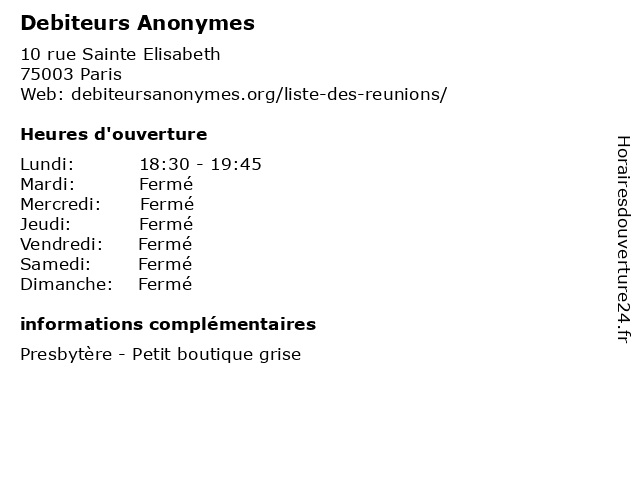 1 Debiteurs Anonymes (Distance: 0,00 km) 10 rue Sainte Elisabeth, 75003 Paris aide, anonymes, debiteurs, debiteurs anonymes, honte, problemes, reunions 2 Debiteurs Anonymes (Distance: 1,52 km) 12 rue de l'Aqueduc, 75010 Paris aide, anonymes, debiteurs, debiteurs anonymes, honte, problemes, reunions 3 Debiteurs Anonymes (Distance: 1,99 km) 23 rue de la Sourdière, 75001 Paris aide, anonymes, debiteurs, debiteurs anonymes, honte, problemes, reunions 4 Debiteurs Anonymes (Distance: 2,62 km) 177 rue de Charonne- Ageca, 75011 Paris aide, anonymes, debiteurs, debiteurs anonymes, honte, problemes, reunions 5 Debiteurs Anonymes (Distance: 3,88 km) 174 rue du faubourg Saint Honoré, 75008 Paris aide, anonymes, debiteurs, debiteurs anonymes, honte, problemes, reunions 6 Debiteurs Anonymes (Distance: 3,99 km) 105 rue Saint Dominique, 75007 Paris aide, anonymes, debiteurs, debiteurs anonymes, honte, problemes, reunions |