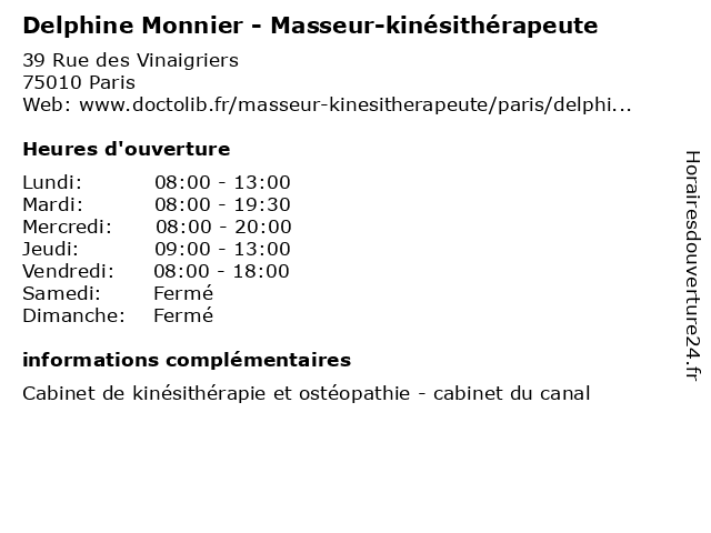 1 Dr Delphine Schmidt Mercier - Chirurgien-dentiste (Distance: 0,65 km) 29 Boulevard Jules Ferry, 75011 Paris chirurgien, delphine, dentiste, dr, mercier, médecin, médecine, médical, pharmaceutique, schmidt, traitement 2 Lemonnier Delphine - Infirmier - Infirmière (Distance: 0,89 km) 85 Rue d'Hauteville, 75010 Paris delphine, docteur, infirmier, infirmière, lemonnier, medecins, sante 3 Maître Delphine David-Godignon - Avocate (Distance: 1,04 km) 33 Rue du Faubourg Poissonnière, 75009 Paris avocate, avocats, cabinet, conseils, contentieux, david, delphine, godignon, juridique, justice, litiges, maître, services 4 Fournier Delphine (Distance: 1,06 km) 86 Boulevard De Sebastopol, 75003 Paris delphine, fournier, restaurants 5 Delphine Sautel - Masseur-kinésithérapeute (Distance: 1,27 km) 6 Rue Petrelle, 75009 Paris bien-être, delphine, en, forme, kinésithérapeute, kinésithérapie, masseur, remise, rééducation, sautel 6 Blanche Monnier de Saint Pereuse - Ostéopathe (Distance: 1,27 km) 12 Rue des Petits Carreaux, 75002 Paris blanche, de, monnier, ostéo, ostéopathe, ostéopathes, pereuse, saint, soins |