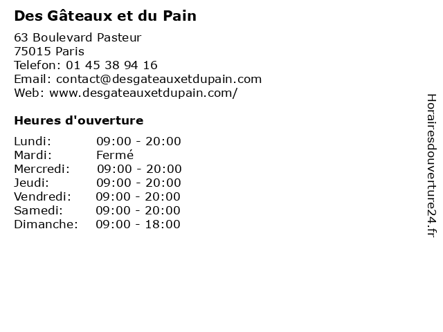 1 Des Gâteaux et du Pain (Distance: 1,56 km) 89 Rue du Bac, 75007 Paris biscuiterie, cakes, confiserie, des, du, et, gâteaux, pain, pâtisseries 2 Pomme de Pain (Distance: 0,42 km) 17 Boulevard de Vaugirard, 75741 Paris cafe, chaussures, de, enfants, homme, mode femme, pain, pomme, restaurant, service, sport 3 Pomme de Pain (Distance: 0,52 km) 66 Boulevard du Montparnasse, 75015 Paris bistrot, de, pain, pomme, restaurant 4 Pain et Olives (Distance: 0,75 km) 11 Rue d' Odessa, 75014 Paris et, olives, pain, plakias, restaurants, restauration, sacha 5 Le Grenier à Pain Losserand (Distance: 0,90 km) 93 Rue Raymond Losserand, 75014 Paris grenier, le, losserand, pain 6 Mamie Gâteaux (Distance: 1,08 km) 66 Rue du Cherche-Midi, 75006 Paris business, gâteaux, mamie, shop, tea |