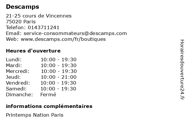 1 Descamps (Distance: 3,68 km) 52 rue de Rivoli, 75004 Paris boutique, descamps, linge, maison, serviette 2 Descamps (Distance: 5,64 km) 24 rue de Sèvres, 75007 Paris boutique, descamps, linge, maison, serviette 3 Descamps (Distance: 5,80 km) 40 boulevard Haussmann, 75009 Paris boutique, descamps, linge, maison, serviette 4 Descamps (Distance: 8,34 km) 144 rue de Courcelles, 75017 Paris boutique, descamps, linge, maison, serviette 5 Descamps (Distance: 8,96 km) 44 rue de Passy, 75016 Paris boutique, descamps, linge, maison, serviette 6 Descamps (Distance: 16,03 km) 134 Avenue de la Plaine de France, 95500 Gonesse beaute, bijoux, chaussures, descamps, enfants, maison, mode femme, mode homme, restaurant, service, sport |