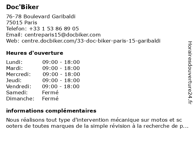 2 Doc'Biker (Distance: 1,33 km) 3 rue Rosenwald, 75015 Paris atelier, doc'biker, entretien, motos, réparation, véhicules 3 Doc'Biker (Distance: 2,06 km) 185, Av du Maine, 75014 Paris brands, doc'biker, maintenance, motorcycle tires, packages scooter, scooter tires 4 Doc'Biker (Distance: 2,50 km) 49, Av de Versailles, 75016 Paris brands, doc'biker, maintenance, motorcycle tires, packages scooter, scooter tires 6 |