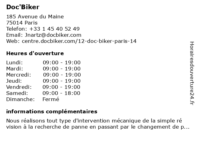 1 Doc'Biker (Distance: 0,01 km) 185, Av du Maine, 75014 Paris brands, doc'biker, maintenance, motorcycle tires, packages scooter, scooter tires 3 Doc'Biker (Distance: 1,46 km) 3 rue Rosenwald, 75015 Paris atelier, doc'biker, entretien, motos, réparation, véhicules 6 Doc'Biker (Distance: 4,22 km) 49, Av de Versailles, 75016 Paris brands, doc'biker, maintenance, motorcycle tires, packages scooter, scooter tires |