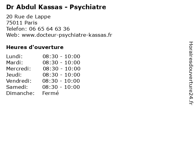 1 Dr Abdul Kassas - Psychiatre (Distance: 0,01 km) 20 Rue de Lappe, 75011 Paris abdul, dr, folie, kassas, psychiatre, psychiatrie, psychiatrique 2 Dr Gérard Tixier - Psychiatre (Distance: 0,41 km) 10 Rue Saint-Antoine, 75004 Paris cabinet, consultation, dr, gérard, psychiatre, psychologie, santé, tixier 3 Dr. Klotz Liliane - Psychothérapeute-Psychiatre (Distance: 2,24 km) 4 Rue Santerre, 75012 Paris docteur, dr., klotz, liliane, medecins, psychiatre, psychothérapeute, sante 4 Dr. Duvigneaud Laurence - Psychiatre (Distance: 2,24 km) 4 Rue Santerre, 75012 Paris docteur, dr., duvigneaud, laurence, medecins, psychiatre, sante 5 Dr. Dartois Luc - Psychiatre (Distance: 2,24 km) 4 Rue Santerre, 75012 Paris dartois, docteur, dr., luc, medecins, psychiatre, sante 6 Dr. Teboul Roger - Psychiatre (Distance: 2,24 km) 4 Rue Santerre, 75012 Paris docteur, dr., medecins, psychiatre, roger, sante, teboul |