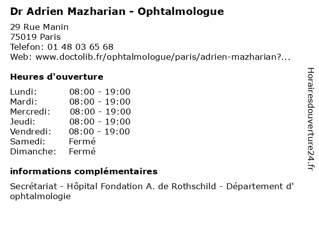 1 Dr Adrien Mazharian - Ophtalmologue (Distance: 0,77 km) 29 Rue Manin, 75019 Paris adrien, consultation, docteur, dr, mazharian, med, médecin, médecine, ophtalmologue, secrétariat, traitement 2 Dr Eric Gabison - Ophtalmologue (Distance: 0,00 km) 29 Rue Manin, 75019 Paris dr, eric, gabison, médecine, ophtalmologistes, ophtalmologue, santé, secrétariat, traitements 3 Dr Edgard Farah - Ophtalmologue - Consultations et Examens Specialises (Distance: 0,00 km) 29 Rue Manin, 75019 Paris consultations, dr, edgard, et, examens, farah, médecin, médecine, médical, ophtalmologue, pharmaceutique, specialises, traitement 4 Dr Olivier Lequoy - Ophtalmologue - Consultations et Examens Specialises (Distance: 0,00 km) 29 Rue Manin, 75019 Paris consultations, dr, et, examens, lequoy, médecin, médecine, médical, olivier, ophtalmologue, pharmaceutique, specialises, traitement 5 Dr Charles Sitbon - Ophtalmologue - Consultations et Examens Specialises (Distance: 0,00 km) 29 Rue Manin, 75019 Paris charles, consultations, dr, et, examens, médecin, médecine, médical, ophtalmologue, pharmaceutique, sitbon, specialises, traitement 6 Dr Catherine Vignal-Clermont - Ophtalmologue - Consultations et Examens Specialises (Distance: 0,00 km) 29 Rue Manin, 75019 Paris catherine, clermont, consultations, dr, et, examens, médecin, médecine, médical, ophtalmologue, pharmaceutique, specialises, traitement, vignal |