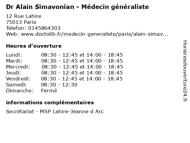 | Lundi | 08:30-12:45 et 14:00-18:45 |
