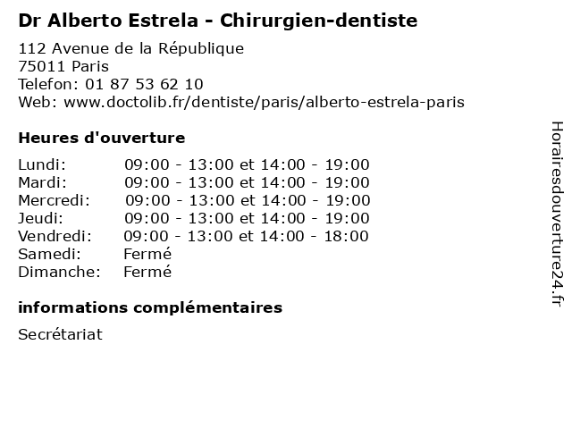 1 Rebolledo Solleiro Rebolledo Alberto (Distance: 0,65 km) 11 Rue Du Pressoir, 75020 Paris alberto, rebolledo, restaurants, solleiro 3 Dr Alberto Estrela - Stomatologue (Distance: 2,54 km) 147 Rue Manin, 75019 Paris alberto, dr, estrela, médecin, médecine, médical, pharmaceutique, stomatologue, traitement 4 Dr Alberto Estrela Martinez - Chirurgien-dentiste (Distance: 2,54 km) 147 Rue Manin, 75019 Paris alberto, chirurgien, consultation, dentiste, docteur, dr, estrela, martinez, med, médecin, traitement 5 Les Saveurs d'Alberto (Distance: 2,88 km) 12 Rue Adolphe Mille, 75019 Paris alberto, bar, café, d'alberto, les, restaurants, sarl, saveurs 6 Dr Alberto Tobia - Chirurgien-dentiste (Distance: 4,02 km) 128 Boulevard Macdonald, 75019 Paris alberto, chirurgie, chirurgien, dentaire, dentiste, dr, tobia |