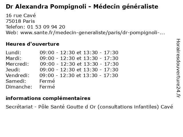 1 Dr Alexandra Pompignoli - Médecin généraliste (Distance: 0,00 km) 16 rue Cavé, 75018 Paris alexandra, consultation, docteur, dr, généraliste, med, médecin, pompignoli, traitement 2 Dr Alexandra Pompignoli - Médecin généraliste (Distance: 1,16 km) 14 rue Tchaïkovski, 75018 Paris alexandra, consultation, docteur, dr, généraliste, med, médecin, pompignoli, traitement 3 Alexandra Lawson - Pédicure - Podologue (Distance: 2,52 km) 15 Rue Tiquetonne, 75002 Paris alexandra, care, clinic, dentist, france, gynécologue, health, kinesitherapeute, lawson, ophtalmologiste, orl, ostéopathe, podologue, psychologue, pédicure, service 4 Dr Alexandra Bonnat - Dentiste (Distance: 5,09 km) 110 Rue de Montreuil,, 75011 Paris alexandra, bonnat, care, clinic, dentiste, dr, medecin 5 Dr. Alexandra Germain-Dentiste (Distance: 5,37 km) 18 Rue de Magdebourg, 75016 Paris alexandra, consultation, dentiste, docteur, dr., germain, santé 6 L'Alexandra (Distance: 6,52 km) 6 Rue Pernety, 75014 Paris café, crêpes, dessert, l'alexandra, restaurant, wine |