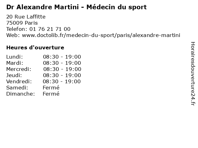 1 Dr Alexandre Martini - Médecin du sport (Distance: 6,42 km) 37 Rue Molitor, 75016 Paris alexandre, docteur, dr, du, generaliste, martini, medecin, médecin, soins, sport 2 Maître Alexandre Diouf - Avocat (Distance: 0,03 km) 27 rue Laffitte, 75009 Paris alexandre, avocat, diouf, droit, maître, négociation 3 Dr Frédéric Genet - Médecin du sport (Distance: 0,11 km) 20 rue Laffitte, 75009 Paris consultation, docteur, dr, du, frédéric, genet, med, médecin, médecine, sport, traitement 4 Dr Victoria Tchaikovski - Médecin du sport (Distance: 0,11 km) 20 rue Laffitte, 75009 Paris consultation, docteur, dr, du, med, médecin, médecine, sport, tchaikovski, traitement, victoria 5 Dr Noamane Moudden - Médecin du sport (Distance: 0,11 km) 20 rue Laffitte, 75009 Paris consultation, docteur, dr, du, med, moudden, médecin, médecine, noamane, sport, traitement 6 Dr Jean-Christophe Miniot - Médecin du sport (Distance: 0,11 km) 20 rue Laffitte, 75009 Paris christophe, consultation, docteur, dr, du, jean, med, miniot, médecin, médecine, sport, traitement |