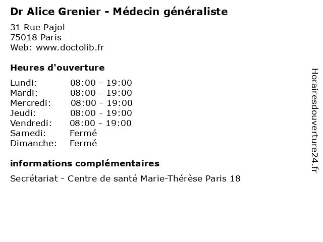 1 Dr Alice Mariano - Chirurgien-dentiste (Distance: 0,91 km) 23 Boulevard Barbès, 75018 Paris alice, chirurgien, dentiste, dr, mariano, médecin, médecine, médical, pharmaceutique, traitement 2 Dr Alice Bialot - Gynécologue médicale (Distance: 1,18 km) 46 Rue Custine, 75018 Paris alice, bialot, docteur, dr, gynecologue, gynécologue, médicale, obstretricien, sante 3 Résidence Médicalisée Alice Guy - Fondation COS (Distance: 1,42 km) 10 Rue de Colmar, 75019 Paris alice, cos, fondation, guy, médicalisée, paris, résidence 4 Alice Paillereau Musique - Professeur de piano (Distance: 2,57 km) 34 Avenue Jean Jaurès, 93500 Pantin alice, de, musique, paillereau, piano, professeur, professeur de piano 5 Alice Martins - Psychologue (Distance: 2,73 km) 57 Rue Charlot, 75003 Paris alice, folie, martins, psychiatre, psychiatrie, psychiatrique, psychologue 6 Alice Boudon - Psychologue (Distance: 2,76 km) 90 Rue Archives, 75003 Paris alice, boudon, cabinets, médecins, psychologue, secrétariat, thérapies |