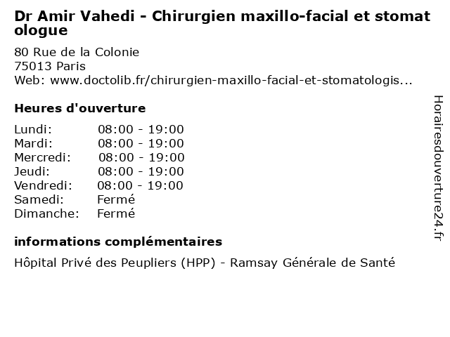 1 Dr Amir Vahedi - Chirurgien maxillo-facial et stomatologue (Distance: 5,70 km) 73 Boulevard du Maréchal Joffre, 92340 Bourg-la-Reine amir, chirurgien, dr, et, facial, maxillo, maxillo-facial, stomatologue, vahedi 2 Dr Romain Swiadkiewicz - Chirurgien maxillo-facial et stomatologue (Distance: 0,04 km) 8 Place de l'Abbé Georges Hénocque, 75013 Paris chirurgie, chirurgien, dr, et, facial, general, maxillo, romain, soins, stomatologue, swiadkiewicz 3 Dr Tiana Andria Andriamboavonjy - Stomatologue (Distance: 0,42 km) 21 Rue du Moulinet, 75013 Paris andria, andriamboavonjy, dr, médecin, médecine, médical, pharmaceutique, stomatologue, tiana, traitement 4 Dr Thieu-Duong Le Nguyen - Stomatologue (Distance: 0,78 km) 11 Rue George Eastman, 75013 Paris dr, duong, le, médecin, médecine, médical, nguyen, pharmaceutique, stomatologue, thieu, traitement 5 Dr Huu-Tam Tran - Stomatologue (Distance: 0,78 km) 11 Rue George Eastman, 75013 Paris dr, huu, médecin, médecine, médical, pharmaceutique, stomatologue, tam, traitement, tran 6 Dr Arthur Liu - Stomatologue (Distance: 2,04 km) 15 Rue du Puits de l'Ermite, 75005 Paris arthur, consultation, docteur, dr, liu, med, médecin, stomatologue, traitement |