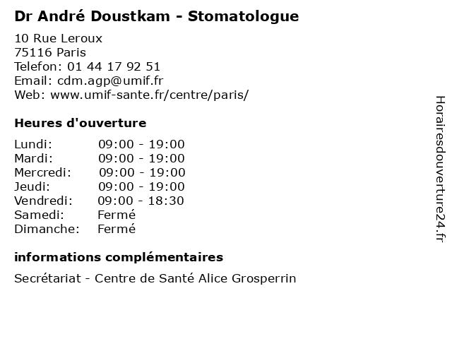 1 Dr André Doustkam - Stomatologue (Distance: 0,00 km) 10 rue Leroux, 75016 Paris andré, consultation, docteur, doustkam, dr, med, médecin, médecine, stomatologue, traitement 2 Tennis André et René Mourlon (Distance: 2,54 km) 19 Rue Gaston de Caillavet, 75015 Paris andré, equipement, et, l'heure, livre, mourlon, médiathèque, rené, services, tennis 3 Parc André-Citroën / Du 25 octobre 2015 au 29 février 2016 (Distance: 3,27 km) 2 rue Cauchy, 75015 Paris 25, 29, 2015, 2016, andré, au, citroën, du, equipement, février, jardins, l'heure, livre, médiathèque, octobre, parc, pricipaux parcs, services 4 Parc André-Citroën / Du 01 mars 2016 au 26 mars 2016 (Distance: 3,27 km) 2 rue Cauchy, 75015 Paris 01, 26, 2016, andré, au, citroën, du, equipement, jardins, l'heure, livre, mars, médiathèque, parc, pricipaux parcs, services 5 Bibliothèque André Malraux (Distance: 3,95 km) 112 Rue de Rennes, 75006 Paris andré, bibliothèque, livre, malraux, médiathèque, services 6 Bibliothèque André Malraux (Jeunesse) (Distance: 3,95 km) 112 Rue de Rennes, 75006 Paris andré, bibliothèque, jeunesse, livre, malraux, médiathèque, services |