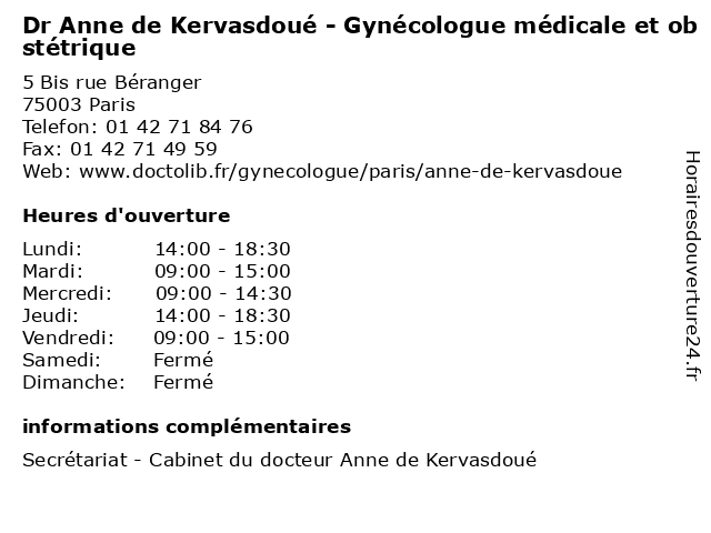 1 Dr Philippe Mintz - Gynécologue obstétricien (Distance: 0,12 km) 15 Rue Béranger, 75003 Paris dr, gynécologue, mintz, médecin, médecine, médical, obstétricien, pharmaceutique, philippe, secretariat, traitement 2 MADAME ANNE LAURE DELAPORTE (Distance: 0,16 km) 22 Rue De Picardie, 75003 Paris 3ème anne, delaporte, laure, madame 3 Anne Kerambrun Vasseur - Psychologue (Distance: 0,23 km) 113 Rue de Turenne, 75003 Paris anne, folie, kerambrun, psychiatre, psychiatrie, psychiatrique, psychologue, vasseur 4 Maître Anne-Sophie Wafo-Tapa - Avocate (Distance: 0,25 km) 160 rue du Temple, 75003 Paris anne, avocate, avocats, cabinet, conseils, contentieux, juridique, justice, litiges, maître, services, sophie, tapa, wafo 5 Dr Anne Robain - Pneumologue (Distance: 0,31 km) 36 Rue Debelleyme, 75003 Paris anne, consultation, docteur, dr, médecins, pneumologie, pneumologue, robain, santé 6 Dr Laurence Guiot - Gynécologue (Distance: 0,41 km) 38 Boulevard Voltaire, 75011 Paris care, clinic, dentist, dr, france, guiot, gynécologue, health, laurence, service |