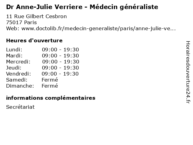 1 Maître Anne-Virginie Chauvin-Hameau-Madeira - Avocate (Distance: 0,15 km) 3 Rue Fragonard, 75017 Paris anne, avocate, avocats, cabinet, chauvin, conseils, contentieux, hameau, juridique, justice, litiges, madeira, maître, services, virginie 2 Dr Julie Pargade - Chirurgien-dentiste (Distance: 0,67 km) 92-98 Boulevard Victor Hugo, 92110 Clichy chirurgien, consultation, dentiste, docteur, dr, julie, med, médecin, pargade, traitement 3 Dr Julie Le Rousseau - Psychologue (Distance: 0,78 km) 30 Rue Salneuve, 75017 Paris cabinets, dr, julie, le, médecins, psychologue, rousseau, secrétariat, thérapies 4 Anne Caillaud - Psychologue (Distance: 1,12 km) 258 Rue Marcadet, 75018 Paris anne, caillaud, psy, psychiatre, psychologue, sante, soins 5 Anne-Sophie Isaac - Etiopathe (Distance: 1,16 km) 13 Rue de Tocqueville, 75017 Paris anne, consultation, docteur, etiopathe, isaac, med, médecin, sophie, traitement 6 Lellouche Ava Jocelyne Julie (Distance: 1,18 km) 133 Rue Lamarck, 75018 Paris ava, jocelyne, julie, lellouche, restaurants |