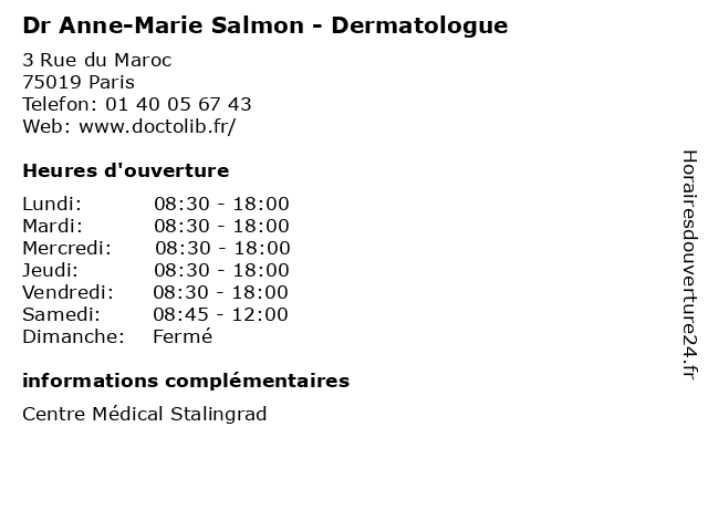 1 Dr Anne-Marie Salmon - Dermatologue et vénérologue (Distance: 0,00 km) 3 Rue du Maroc, 75019 Paris anne, consultation, dermatologue, docteur, dr, et, marie, med, médecin, salmon, traitement, vénérologue 2 Dr Jean-Marc Grenier - Dermatologue (Distance: 0,00 km) 3 Rue du Maroc, 75019 Paris dermatologue, dr, grenier, jean, marc, médecin, médecine, médical, pharmaceutique, traitement 3 Dr Jean-Marc Grenier - Dermatologue et vénérologue (Distance: 0,00 km) 3 Rue du Maroc, 75019 Paris consultation, dermatologue, docteur, dr, et, grenier, jean, marc, med, médecin, traitement, vénérologue 4 Dr Odile Picard - Dermatologue et vénérologue (Distance: 0,00 km) 3 Rue du Maroc, 75019 Paris consultation, dermatologue, docteur, dr, et, med, médecin, odile, picard, traitement, vénérologue 5 Dr. Salmon - Dermatologie (Distance: 0,08 km) 17-19 Avenue de Flandre, 75954 Paris dermatologie, docteur, dr., medecins, salmon, sante 6 |