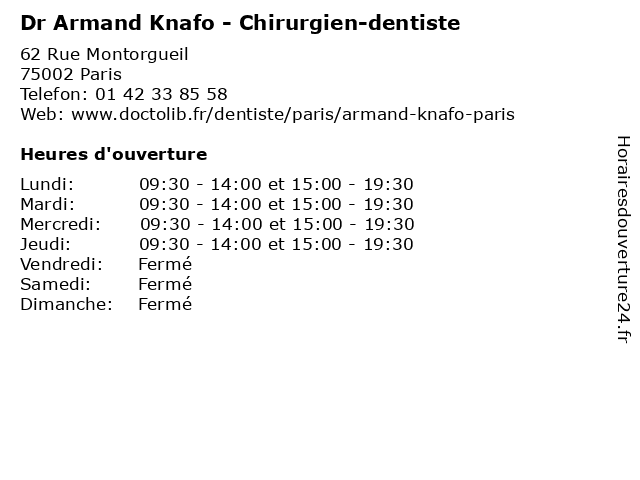 1 Dr Armand Knafo - Dentiste (Distance: 0,01 km) 74 Rue Montorgueil, 75002 Paris armand, care, clinic, dentist, dentiste, dr, france, health, knafo, service 2 Daniela Knafo - Hypnothérapeute & Coach (Distance: 2,00 km) 32 Rue de Londres, 75009 Paris coach, daniela, hypnose, hypnothérapeute, knafo, labl, paris 9, thérapie 4 Dr Yohann Knafo - Chirurgien orthopédiste et traumatologue (Distance: 3,54 km) 8 Rue de Chazelles, 75017 Paris chirurgie, chirurgien, dr, et, general, knafo, orthopédiste, soins, traumatologue, yohann 5 Dr Yohann Knafo - Chirurgien orthopédiste et traumatologue (Distance: 3,56 km) 21 Rue de Chazelles, 75017 Paris chirurgien, consultation, docteur, dr, et, knafo, med, médecin, orthopédiste, traitement, traumatologue, yohann 6 Dr Yohann Knafo - Chirurgien orthopédiste et traumatologue (Distance: 3,56 km) 21 Rue de Chazelles, 75017 Paris chirurgien, consultation, docteur, dr, et, knafo, med, médecin, orthopédiste, traitement, traumatologue, yohann |