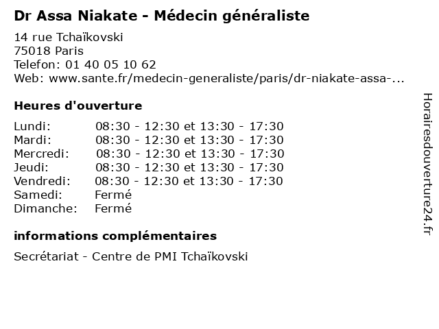 1 Dr Assa Niakate - Médecin généraliste (Distance: 2,06 km) 65 rue René Binet, 75018 Paris assa, consultation, docteur, dr, généraliste, med, médecin, niakate, traitement 2 Dr Assa Niakate - Pédiatre (Distance: 2,61 km) 5 Rue Carpeaux, 75018 Paris assa, consultation, docteur, dr, med, médecin, niakate, pédiatre, traitement 3 Assa Djelou - Psychologue (Distance: 4,60 km) 93 Rue de la République, 93200 Saint-Denis assa, cabinets, djelou, médecins, psychologue, secrétariat, thérapies 4 Assa Djelou - Psychologue - secrétariat (Distance: 4,78 km) 93 Rue de la République, 93200 Saint-Denis assa, cabinets, djelou, médecins, psychologue, secrétariat, thérapies 5 Assa Djelou - Psychologue - secrétariat (Distance: 7,11 km) 28 Rue de la Demi Lune, 93100 Montreuil assa, cabinets, djelou, médecins, psychologue, secrétariat, thérapies 6 Assa Djelou - Psychologue - secrétariat (Distance: 7,37 km) 40 Rue Ambroise Croizat, 93700 Drancy assa, cabinets, djelou, médecins, psychologue, secrétariat, thérapies |