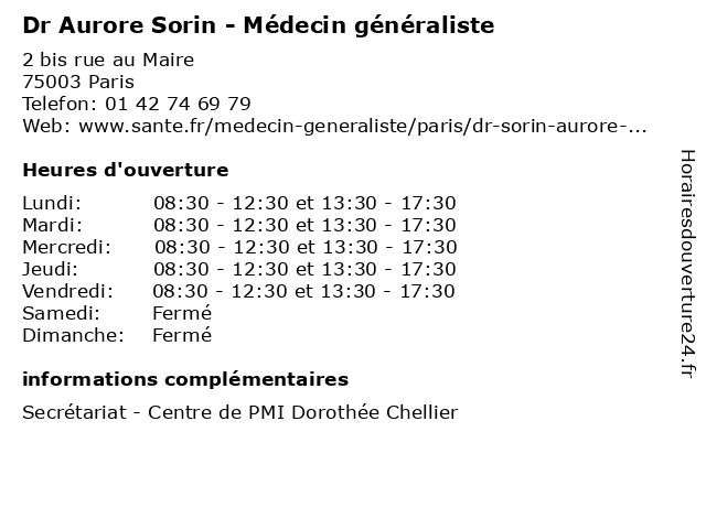 1 Dr Aurore Sorin - Médecin généraliste (Distance: 0,84 km) 2 rue de Moussy, 75004 Paris aurore, consultation, docteur, dr, généraliste, med, médecin, sorin, traitement 2 Dr Aurore Sorin - Médecin généraliste (Distance: 1,21 km) 3 square Alban Satragne, 75010 Paris aurore, consultation, docteur, dr, généraliste, med, médecin, sorin, traitement 3 Dr Aurore Sorin - Médecin généraliste (Distance: 1,29 km) 6 Rue de la Banque, 75002 Paris aurore, consultation, docteur, dr, généraliste, med, médecin, sorin, traitement 4 Dr Aurore Sorin - Médecin généraliste (Distance: 1,84 km) 3 Rue Choron, 75009 Paris aurore, consultation, docteur, dr, généraliste, med, médecin, sorin, traitement 5 Dr Aurore Sorin - Médecin généraliste (Distance: 2,18 km) 55 rue de l'Aqueduc, 75010 Paris aurore, consultation, docteur, dr, généraliste, med, médecin, sorin, traitement 6 Aurore Chauchat - Hypnothérapeute (Distance: 0,80 km) 61 Rue du Faubourg Saint-Martin, 75010 Paris aurore, chauchat, hypnose, hypnotherapeute, hypnothérapeute, sante, soins |